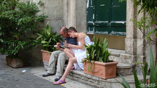 북적거리는 관광객들을 피해 한적한 모퉁이에서 휴식을취하는 노부부의 모습이 인상적입니다.